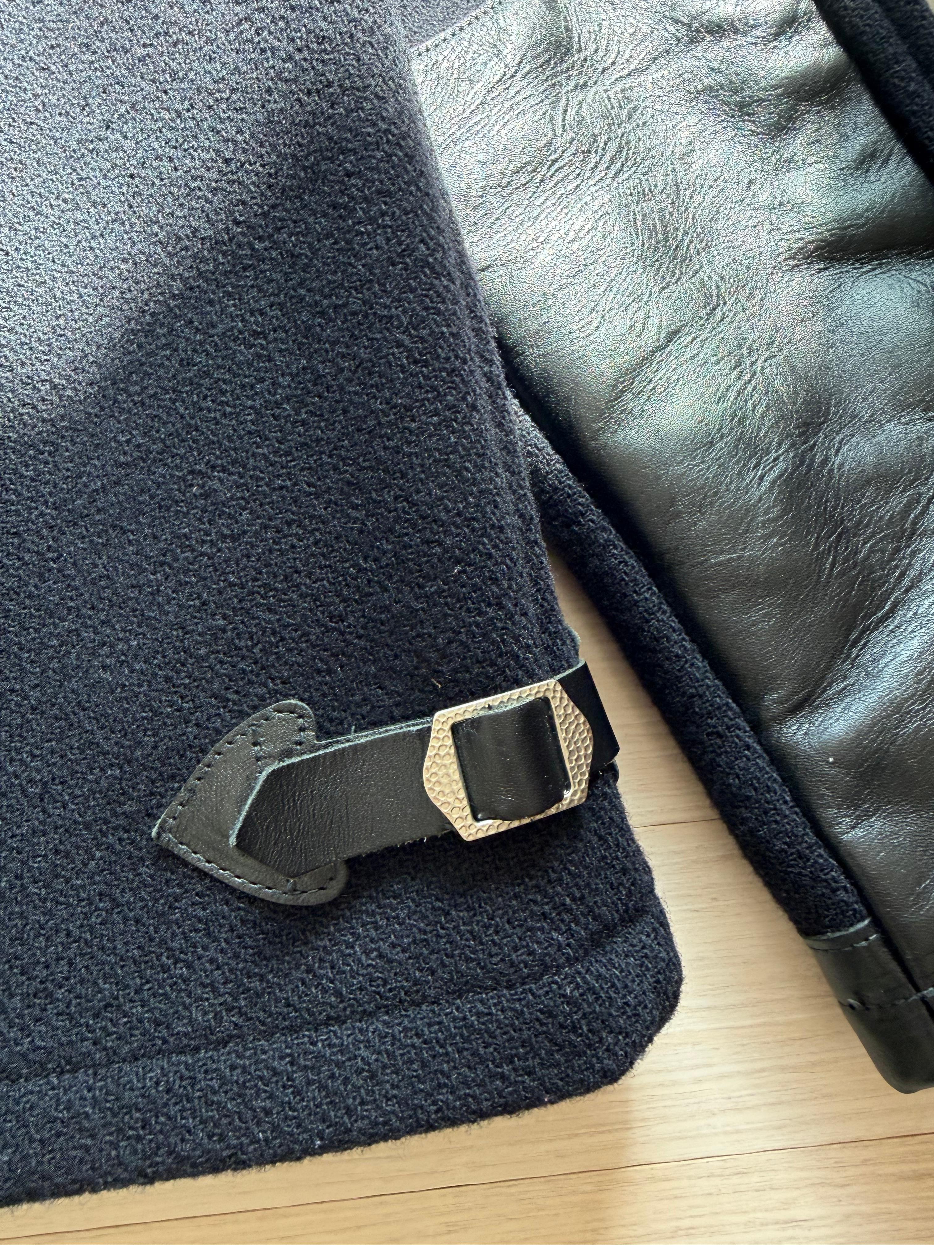 ✅ 가죽 디테일 : 이 자켓의 핵심은 말 가죽(Horsehide) 트리밍 입니다. 주머니 입구, 소매 끝, 그리고 팔꿈치 부분에 고급 말가죽이 덧대어져 있습니다.